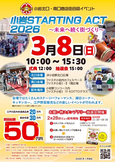 3月8日(日)に開催される【スターティング・アクト2026】🌟 再開発が進むJR小岩駅前南北商店街による合同イベントです。 総合責任者は田中茂南口商店街連合会長、実行委員長は植草誠小岩北口商店街会長が務め、全体運営を福島大輔会長を先頭にする「小岩本気青年会」が担当します。私は実行委員会顧問としてサポートしています。 賞金50万円のスタンプラリー抽選会、中学校吹奏楽部演奏、ストリートパフォーマンス、昔遊び、ヨガなどのステージプログラムをはじめ、キッチンカーや模擬店なども出店します。今日の実行委員会全体会では、企画内容を最終確認!3月8日へ向けてスタートです。 shinichi⌘{CAPTION}