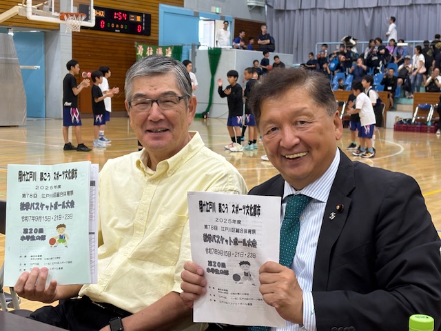 今日は【スポーツの秋】 総合体育館で行われた「ミニバスケットボール🏀秋季リーグ戦決勝戦」応援❗️内野教育長と並んで江戸川区の宝である小学生選手たちの全力プレーに声援を送りました。 また、光栄なことに今日も主催団体である江戸川区バスケット連盟鳥山理事長から、ルールやフォーメーションについて解説いただき、試合の流れをしっかり理解できました。 決勝戦は男女クラス共に大熱戦⭐️ 一進一退のシーソーゲーム^_−☆男子は「松江キッズ」女子は「バンビーノ」が優勝🏆私は閉会式で挨拶に立ち、「笑いも涙も次の試合、大会につながります。これからも頑張ってください。」と呼びかけました。私はこれからもミニバスケットボールをバッチリ👍応援します。 皆さまよろしくお願いします。 shinichi⌘