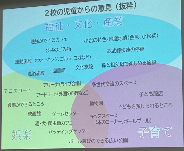 JR小岩駅周辺地区再開発に伴い「未来の小岩はどうあるべきか」をテーマとすると会議体「こいわ未来プロジェクト」。長年、小岩駅前で開業される岩倉病院の岩倉孝雄院長先生を会長に選任し、私は顧問。 会員は地権者、町会自治会長、商店街会長、有識者、地域で活動するサークル代表者など23名で構成されています。加えて地元の下小岩小学校、西小岩小学校の子どもたちにも授業の一環として参加してもらい、「未来の小岩に必要なもの、未来の小岩がこうなったらいいな。」とのアイデアを提供してもらいました(๑・̑◡・̑๑) 今日の会議で「こいわ未来プロジェクト」による意見や提案もかなりまとまり、次回の会議では、ひとつの結論を出す方向です。 shinichi⌘{CAPTION}