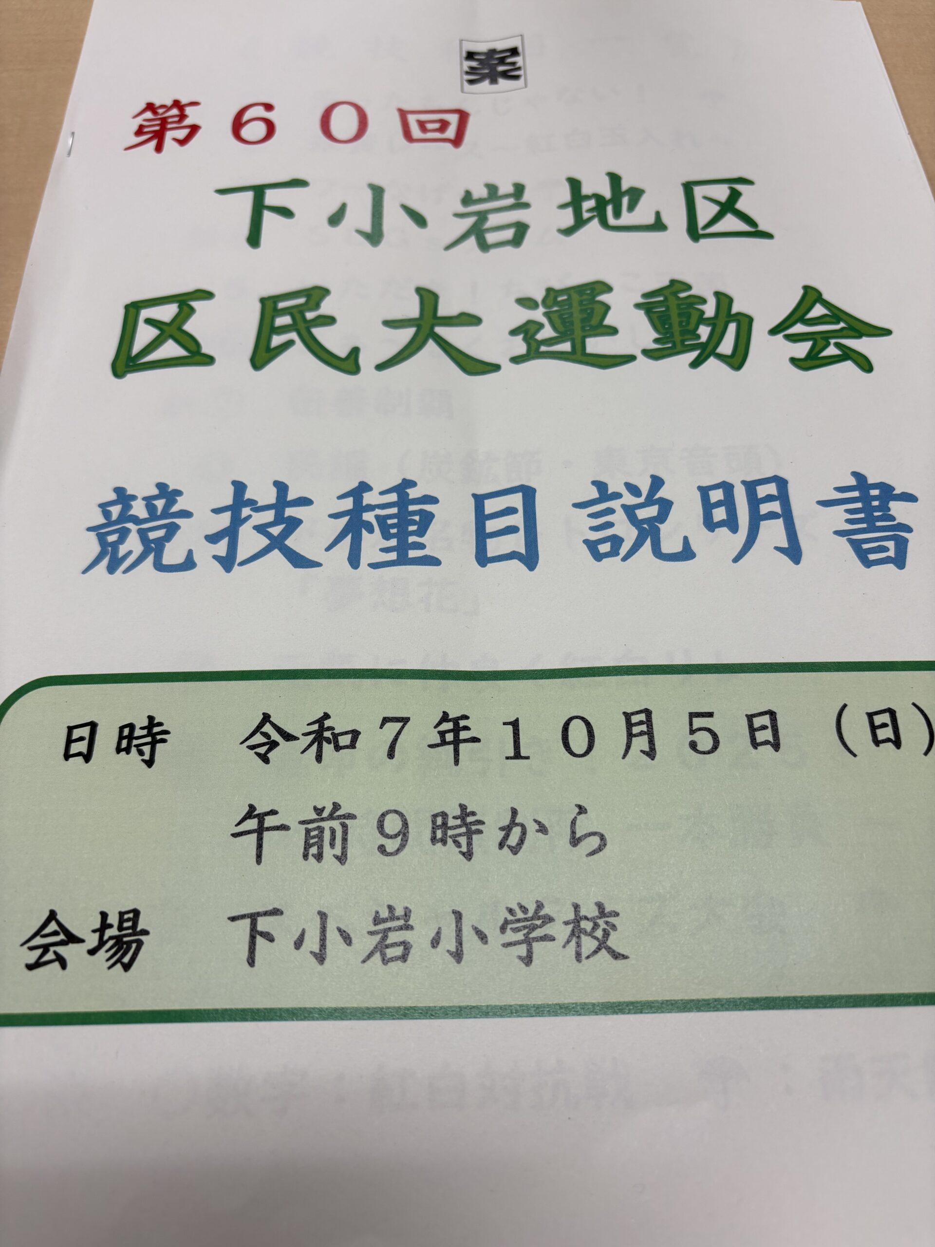 10月5日開催の第60回下小岩地区区民運動会における「種目検討会」が行われ、私は審判部長《大会顧問兼務》として、実行委員の皆さんにオリジナル競技内容を説明しました。特に下小岩地区運動会名物競技「レトロシリーズ」は秀逸⁉️ 毎回、往年のヒット曲にちなんで、ユニークな競技内容で紅白それぞれのチームが勝利を🏆目指します。 今年のタイトルは「夢想花」。 「飛んで〰️♪飛んで〰️🎵」 競技内容は当日のお楽しみです✳️ shinichi⌘{CAPTION}