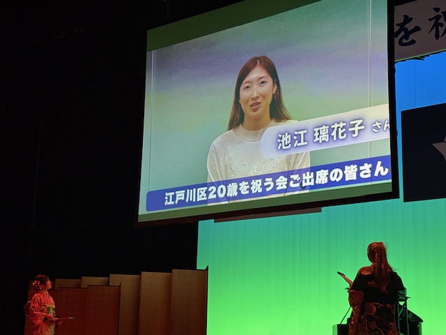 新春三連休最終日。 「二十歳を祝う会」が、総合文化センター大ホールで盛大に催されました。今年江戸川区で二十歳を迎えた方は7158名。その内外国人が1102名となっています。色鮮やかな振袖姿が並び厳粛かつ華やかな雰囲気の中、式典で斉藤区長から祝意をこめて激励の挨拶が送られました。そして、公募で構成された13名による運営委員会の自主企画として第ニ部では《公開アンケート》《池江璃花子選手からのビデオメッセージ》《出席者からのナマ主張》が披露され、会場は盛り上がりました(^_−)−☆