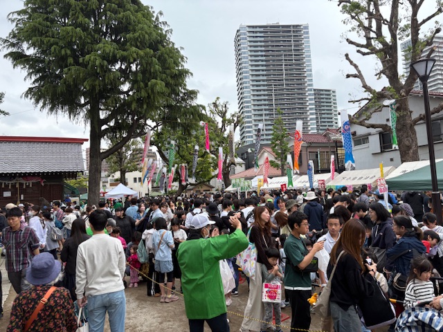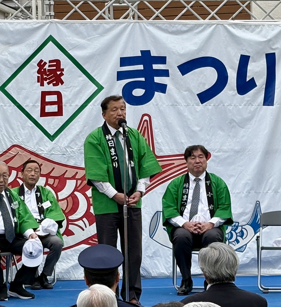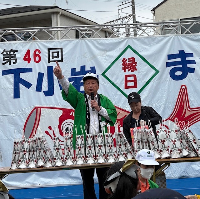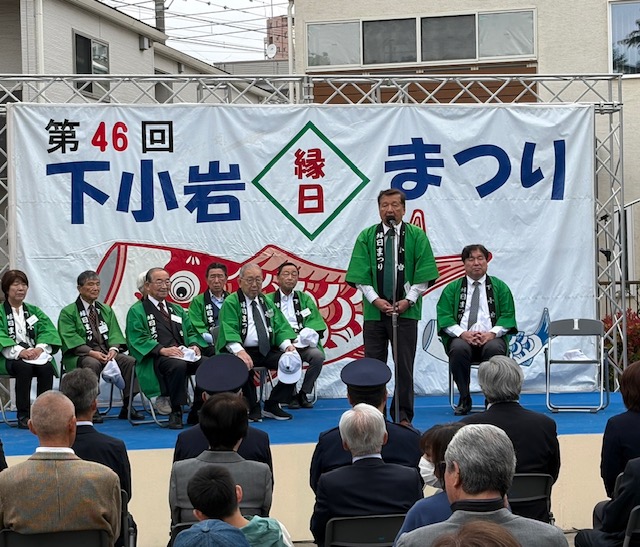 4月29日水曜日。昭和の日の今日から本格的にゴールデンウィークが始まりましたp(^_^)q 曇り空とはなりましたが、気持ちいい風が吹く中、私たちの地域の春を彩るビッグイベント「第46回下小岩縁日まつり」が開催されました。 私は記念式典で大会顧問として挨拶に立ち「11月まで続く小岩の地域祭りトップバッター!区内全域で行われる地域祭りで《縁日》と名がつくのはウチだけ。76年間、この下小岩天祖神社内の児童遊園は地域の縁、住民の縁を繋いできました 私たちの大切な場所です。 式典後もステージプログラムは続き、模擬店は皆さまのお越しをお待ちしております。いつもならお買い物はフラワーロードでという私ですが、今日はお買い物は縁日まつりでお願いします(^.^)皆さんとのご縁に感謝し、皆様のサイフの中にある円にご期待申し上げます。」