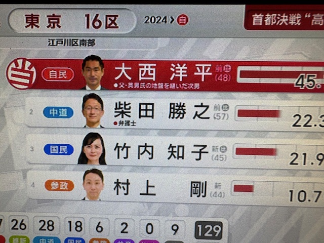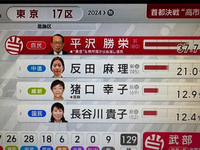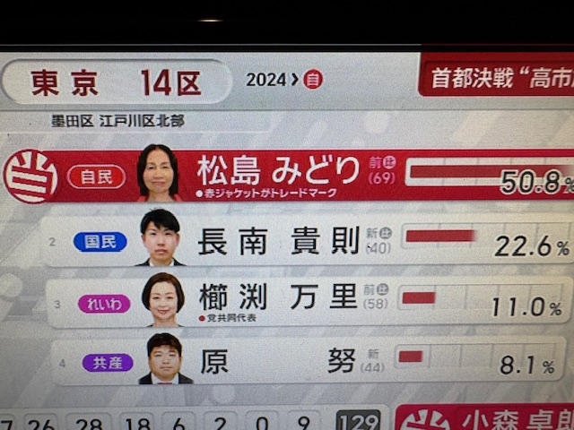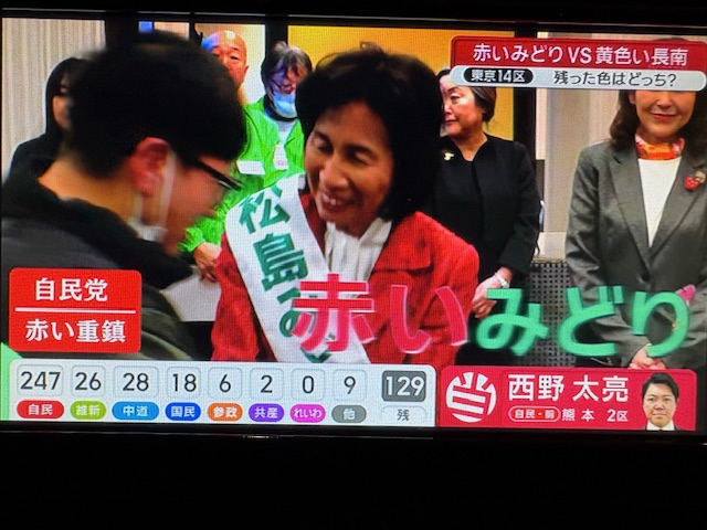 昼から「江戸川区ターゲットバードゴルフ協会支部長新年会」「彩光クラブ新年会」出席。外の降雪さえも話題の一つに置いて、和やかな時間です。夕方から松島みどり候補事務所スタッフとの打ち合わせやマスコミからの問い合わせ対応。緊張感が高まります。20時投票終了。 早々に松島みどり当確‼️の報せが入りました(^^)さらに、16区大西洋平氏、17区平沢勝栄氏が当確㊗️ 自民党歴史的大勝✨です。