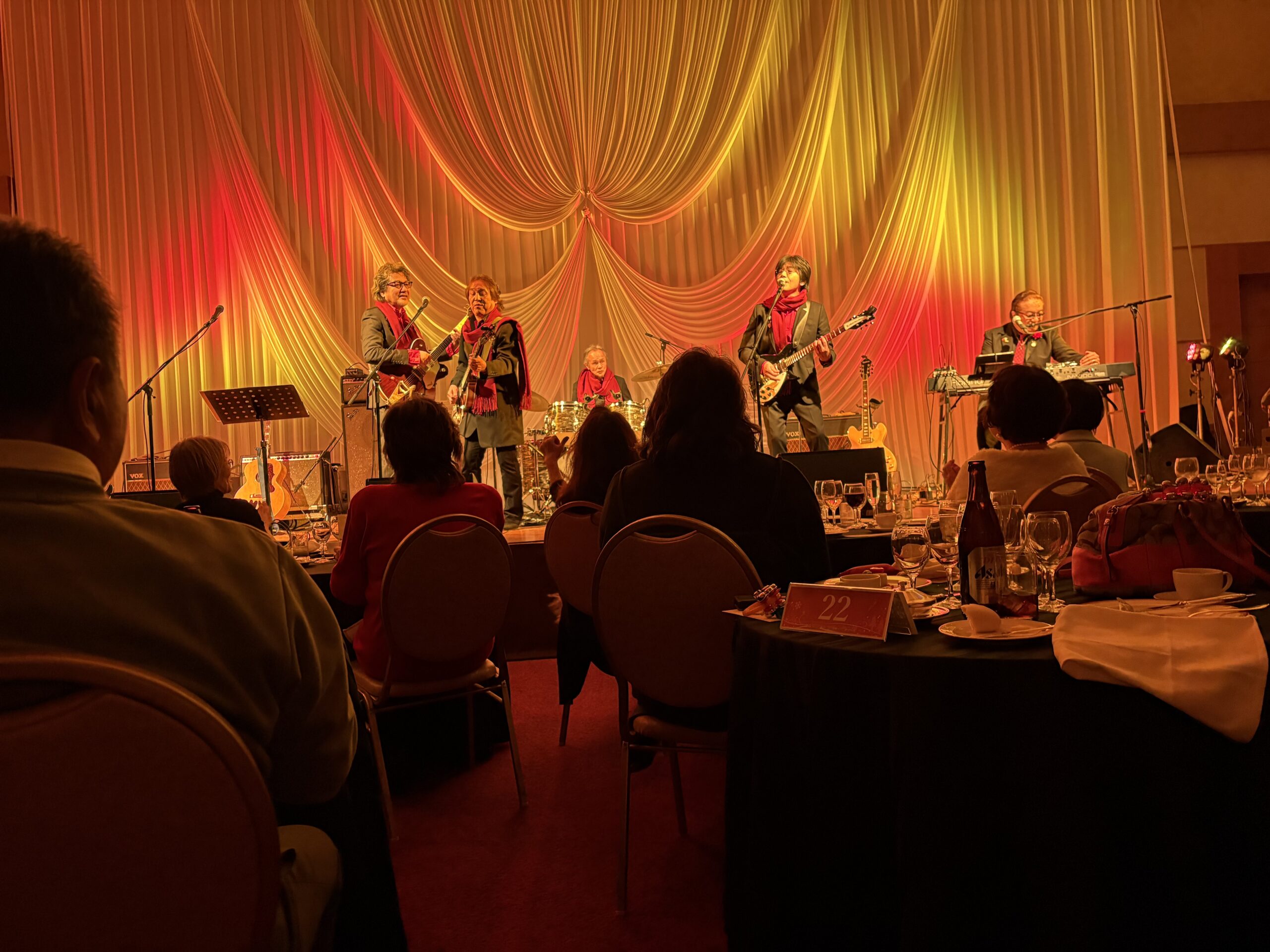 今宵は親しい友人グループと揃って「WISHING♪ Xmas 🎅dinner show」(^^)vビートルズトリビュートバンド「WISHING」のリーダー永沼忠明さんは1980年代にビートルズコピーバンドの草分け的存在のチャック近藤先生率いる「LADY⭐︎BUG」のメンバー❗️私は1986年から活躍を見てきました。今夜はXmasムードいっぱいのステージ🌟大好きなビートルズナンバー😍を楽しみました。 shinichi⌘