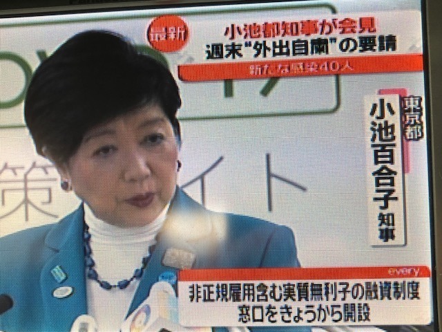 小池都知事による記者会見で「東京で新たに40人の感染者を確認。3日連続で40人を超え感染拡大が続いている。感染爆発の重大局面。今週末の不要不急に外出自粛。」などを呼びかけました。