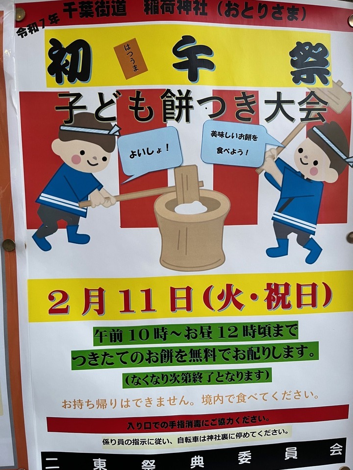 早朝6時集合!ニ東町会主催による「餅つき大会」の準備作業が始まりました.餅米80㌔を用意して、8時前には、早くも身内による餅つき大会スタート。10時からのお餅配布には、親子連れで長蛇の列。私もニ東睦会の仲間と一緒に杵を握りました^_^ニ東町会は上野功会長を中心に非常にバランスのいい組織です。12時「くすのき神明長生会新年会」続いて「末廣会新年会」でご挨拶。強い風の中でしたが、皆さん元気に揃い、ゲームやカラオケに興じました。夜は「東小岩ニ東町会鉢洗い会」で挨拶。昨日の初午祭に続き、大盛況の餅つき大会を祝い、カンパイ🍺お疲れ様でした。